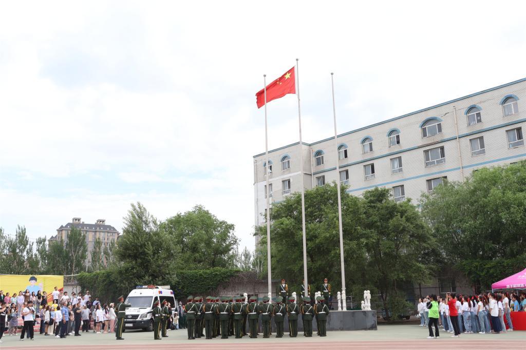 在庄严雄壮的国歌声中,五星红旗在田径场冉冉升起。