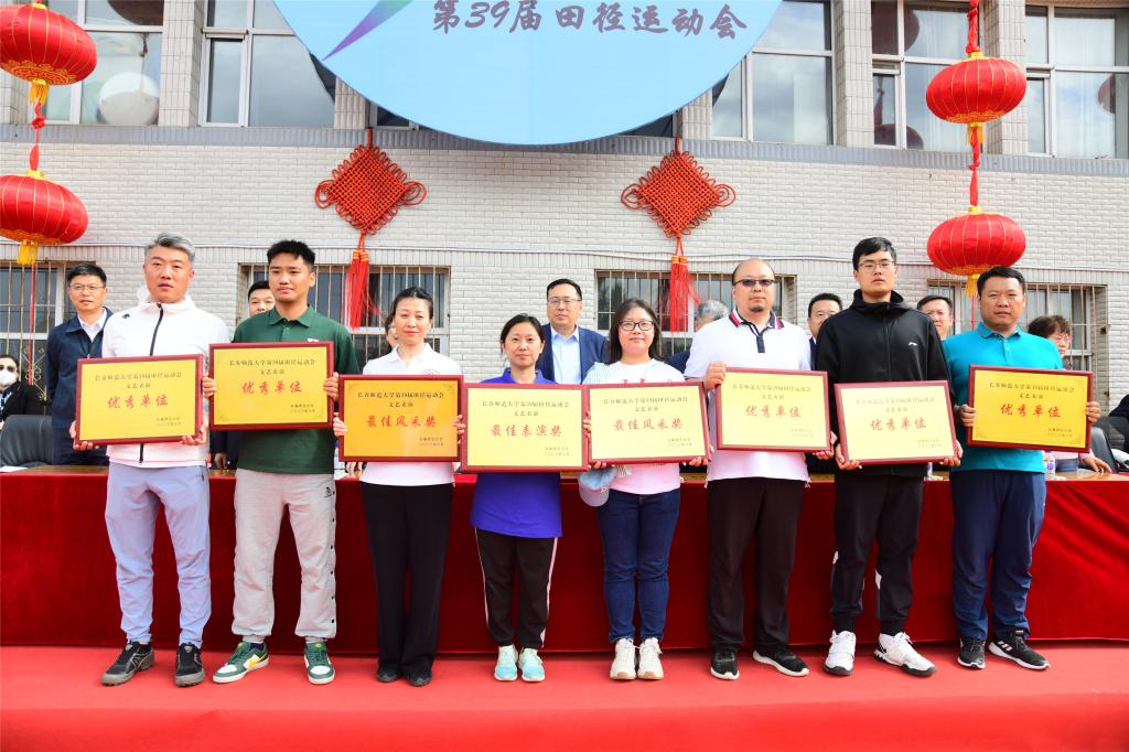 党委常委、宣传部长薛翔宇宣布本届运动会精神文明奖及文艺表演奖获奖名单。体育学院、音乐学院获特殊贡献奖。外国语学院、音乐学院、体育学院、国际交流学院、教育学院、文学院、工程学院、美术学院获精神文明先进单位。历史文化学院获文艺表演最佳表演奖,体育学院、经济管理学院、马克思主义学院获文艺表演最佳风采奖,文学院、生命科学学院、地理科学学院、教育学院、计算机科学与技术学院(软件学院)获文艺表演优秀单位。
