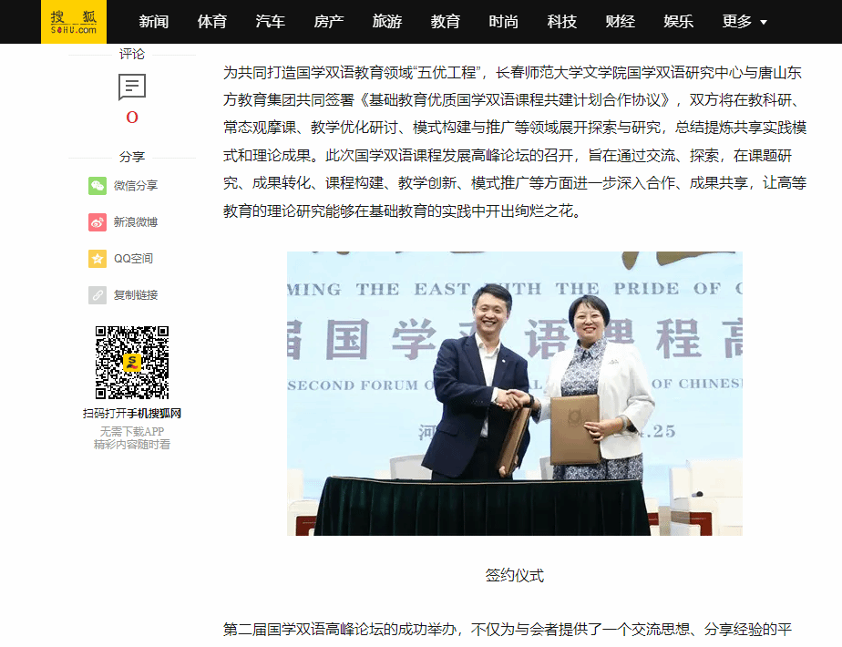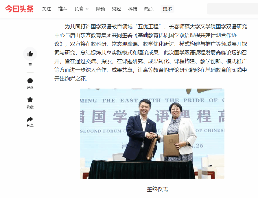 据悉,4月25日,在第二届国韵东方·经典传承——国学双语课程发展高峰论坛中,文学院与唐山东方教育集团共同签署《基础教育优质国学双语课程共建计划合作协议》,共同打造国学双语教育领域“五优工程”。双方将在教科研、常态观摩课、教学优化研讨、模式构建与推广等领域展开深入探索与研究,共享实践模式并高度提炼理论成果。