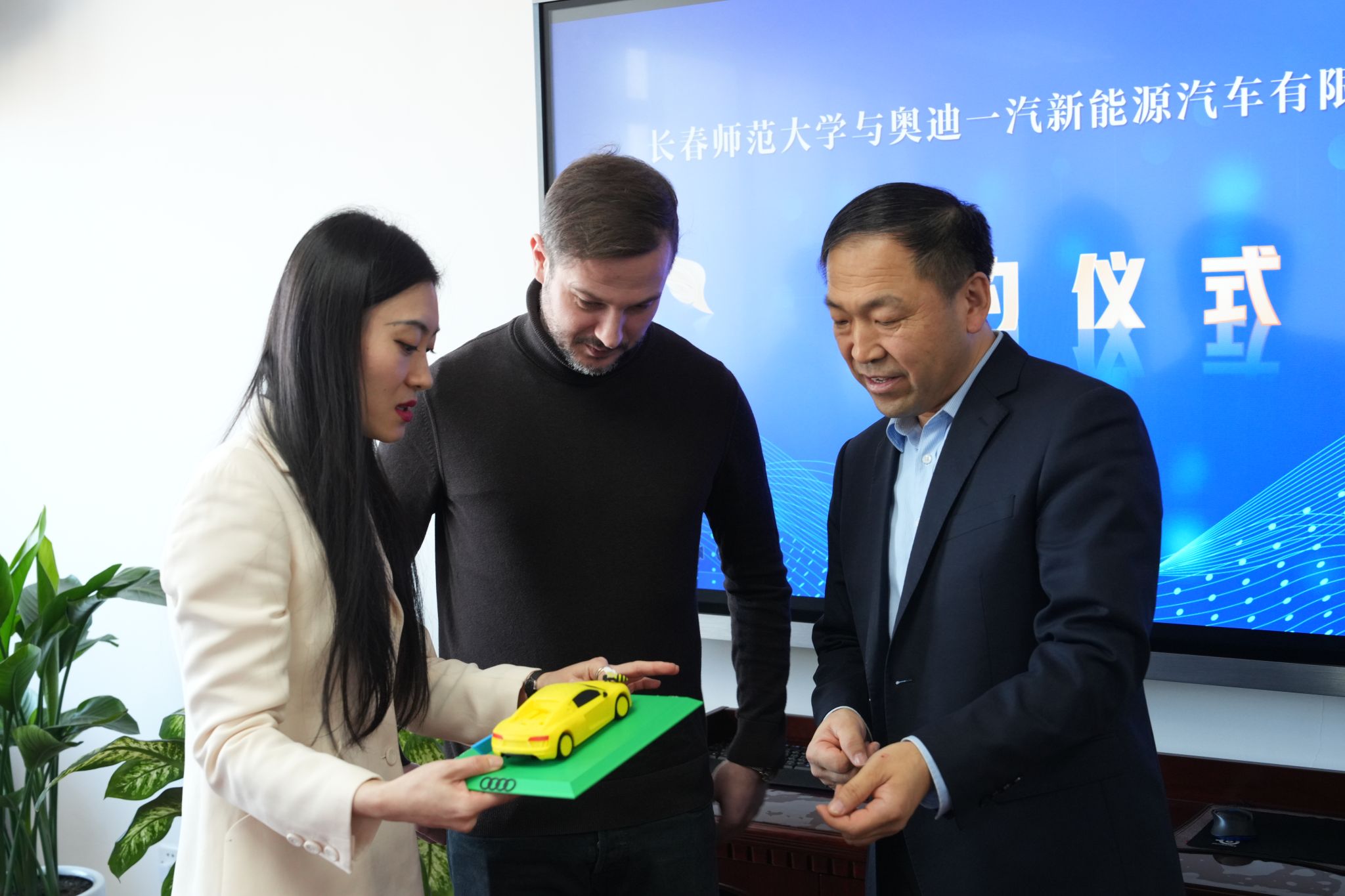 12月10日,学校与奥迪一汽新能源汽车有限公司举行熊蜂项目合作签约仪式。学校副校长吴广峰,奥迪一汽新能源汽车有限公司德方代表Benz Waldemar出席会议。