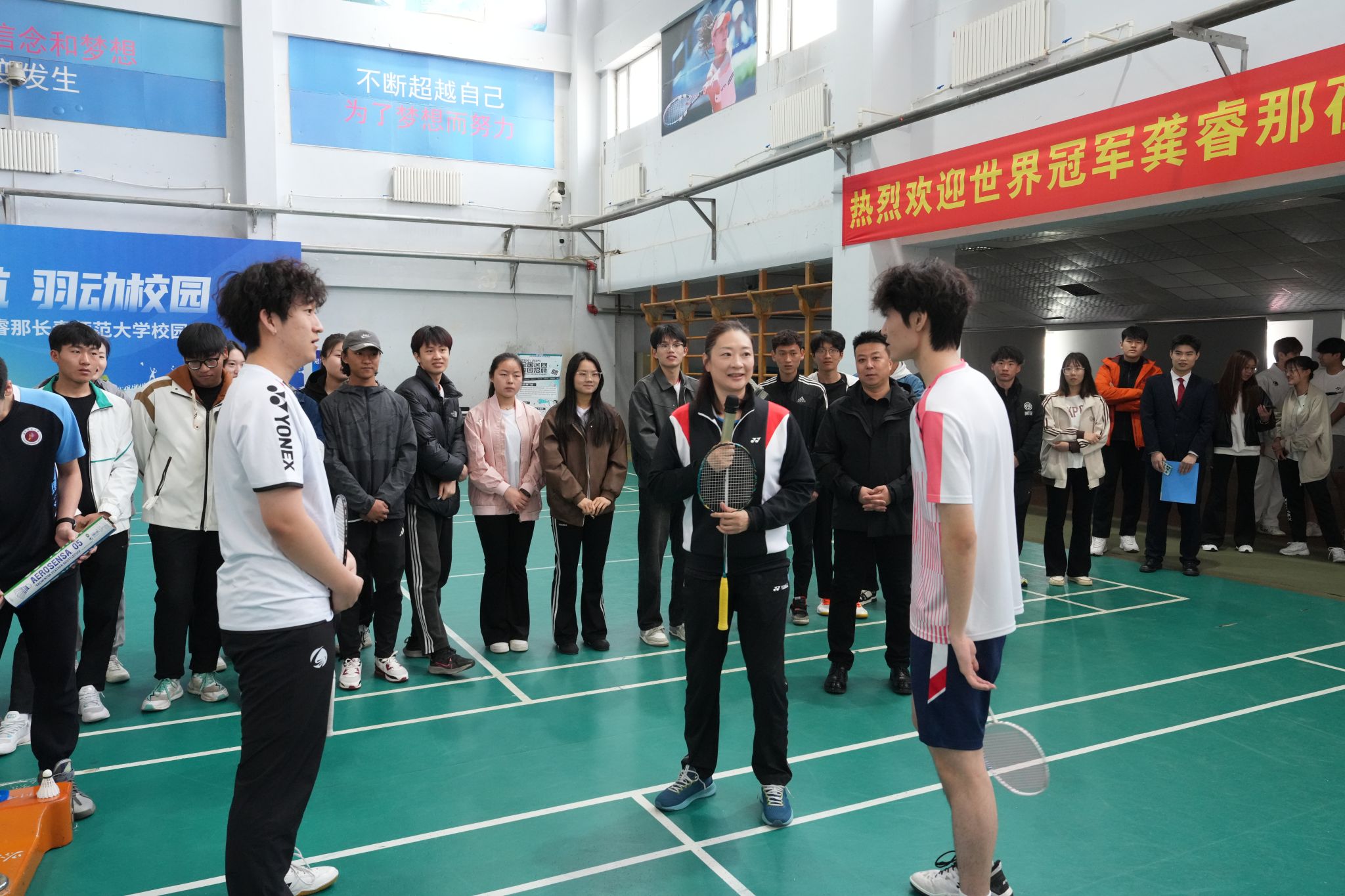 在现场切磋环节,我校羽毛球专业学生与龚睿那边打球边交流,在对抗中展现青春风采。龚睿那亲自担任“教学督导”,通过现场点评和技术指导,帮助学生们改进动作、优化技战术。